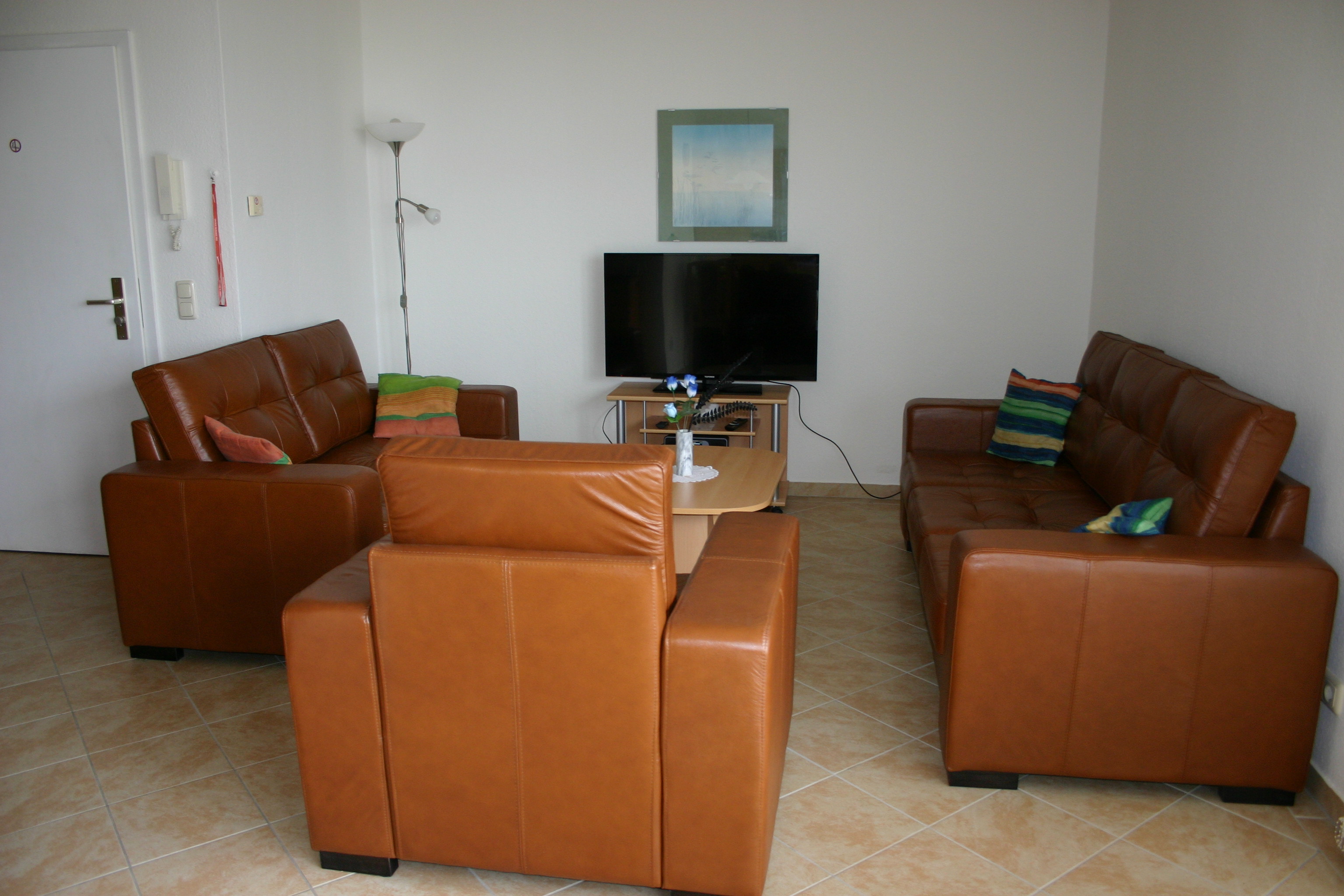 Die Wohnungen haben einen großen Wohnraum mit Küchenzeile, 1 Schlafzimmer mit Doppelbett und ein weiteres Schlafzimmer mit zwei Einzelbetten.. Die Einrichtung ist gediegen, hell und freundlich. Herd mit Backofen, Dunstabzug, Kühlschrank, Geschirrspüler, Kaffeemaschine usw. sind ebenso vorhanden, wie TV, Stereoanlage und Radio. DU/WC in allen Wohnungen ist selbstverständlich. In der kalten Jahreszeit sorgt die Fußbodenheizung für Behaglichkeit.